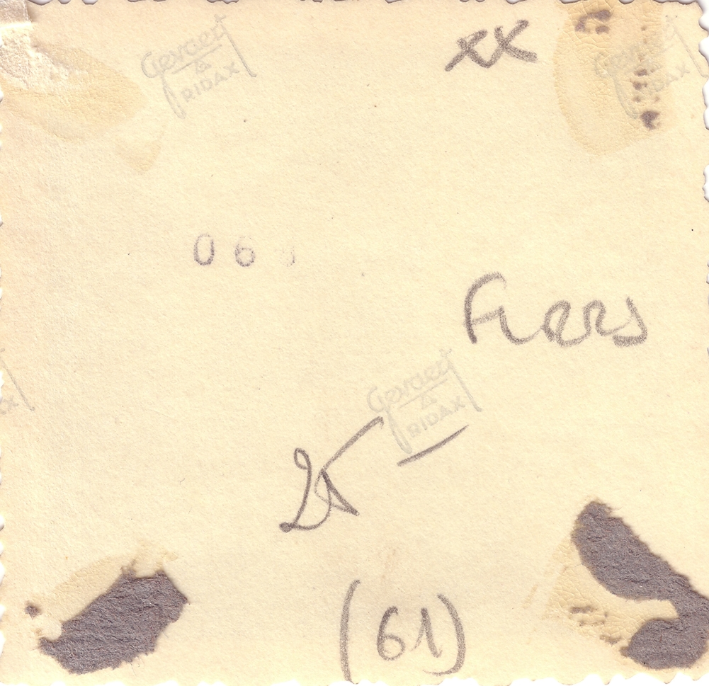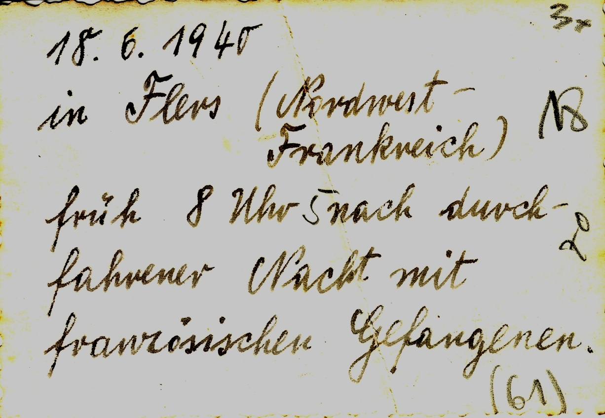Photo n°1, recto et verso : Ironie de l'histoire, elle date du 18 juin 1940, jour de l'appel du Général de Gaulle. Elle montre des militaires allemands joyeux encadrant quelques prisonniers français. Elle a pu être prise dans le haut de la rue de Paris, ou peut-être rue de Domfront. 18.6.1940 in Flers (Nordwest-Frankreich) früh 8 Uhr 5 nach durch fahrener Nacht mit französischen Gefangenen 18.6.1940 à Flers (Nord-ouest de la France) tôt à 8h05 après une nuit prolongée avec des prisonniers français