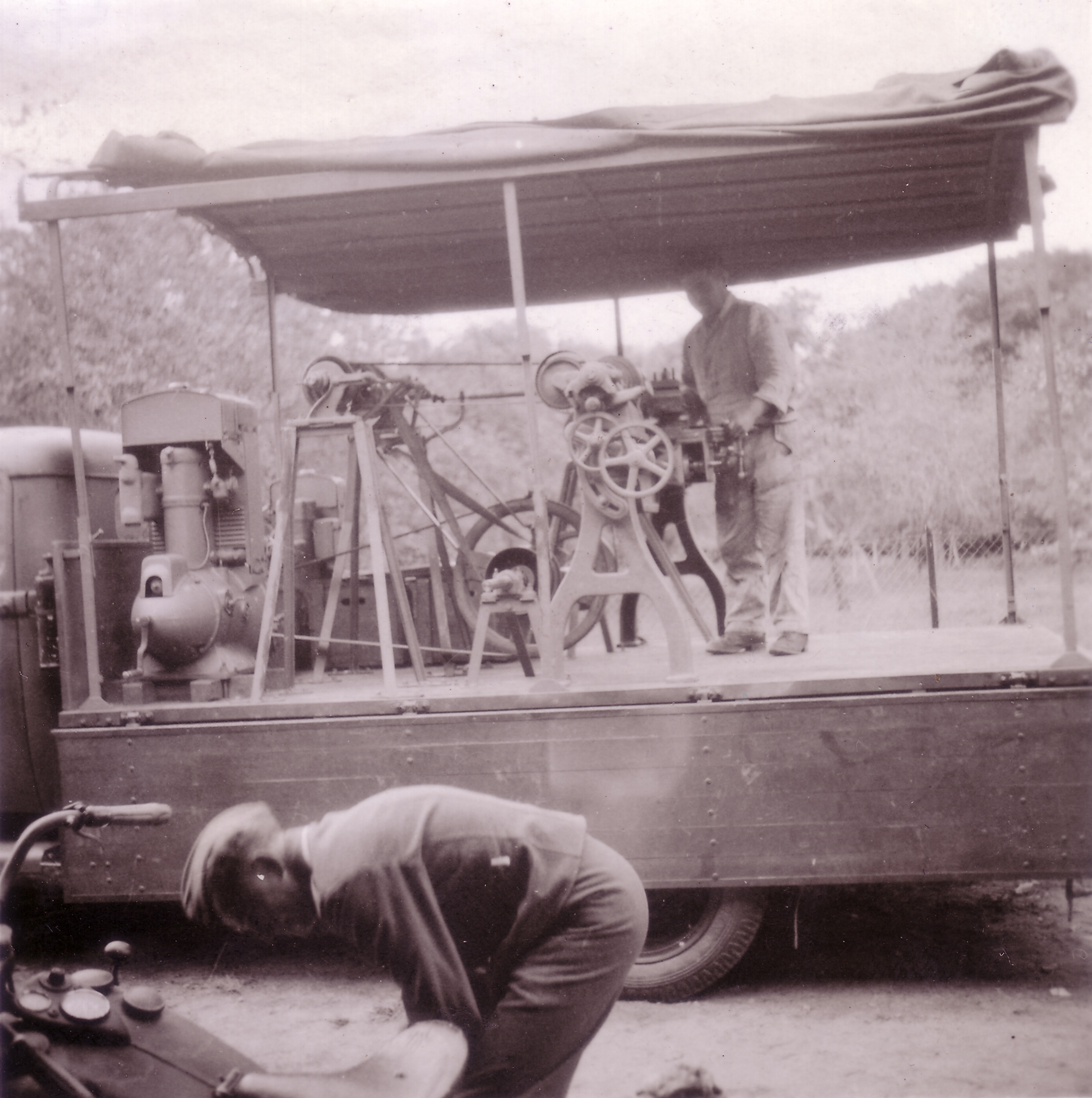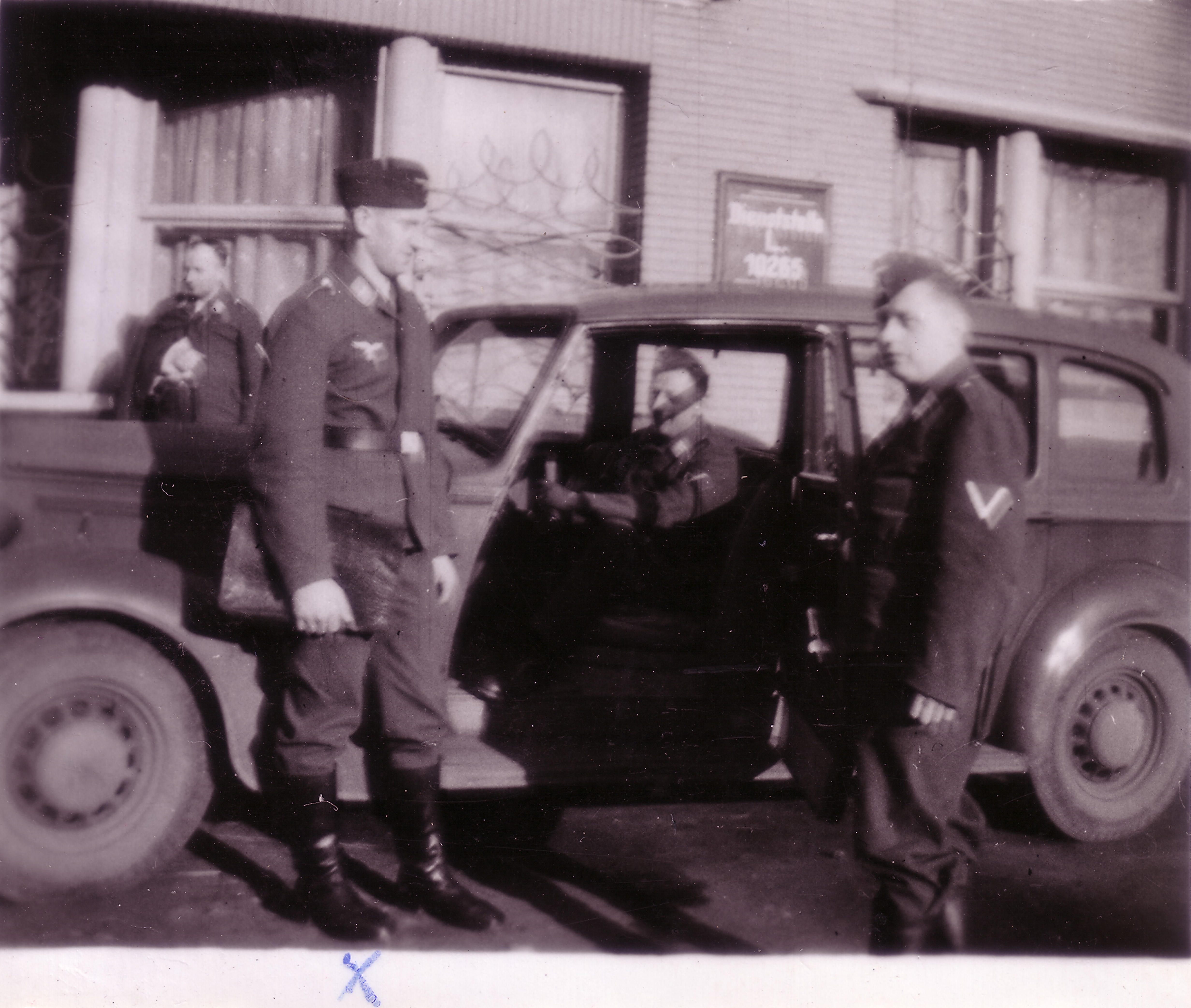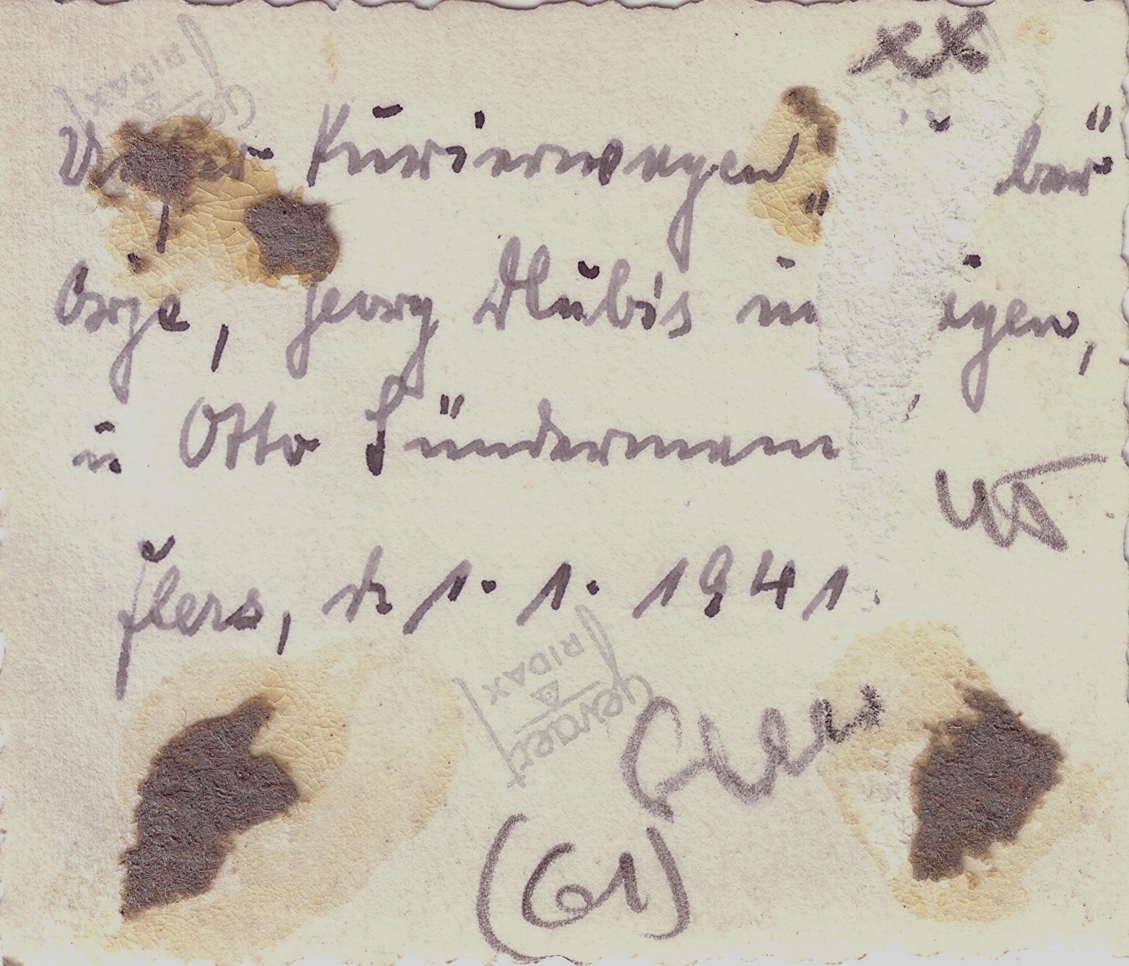 Photo n°2, recto et verso : On lit sur le panneau: Dienststelle L. 10265 (Département L. 10265). Le plus grand homme, que l'on retrouve sur la photo suivante tenant toujours fermement son dossier, est marqué d'une croix. L'homme de droite figure apparemment aussi sur la photo n°4. C'est un caporal (Gefreiter), voire caporal-chef (Obergefreiter), la nuance étant un galon simple ou double en bordure, mais la photo un peu floue permet difficlement la distinction. ... , Georg Hübis im Wagen, und Otto Sündermann. Flers, der 1.1.1941 ... , Georg Hübis en voiture, et Otto Sündermann. Flers, le 1.1.1941