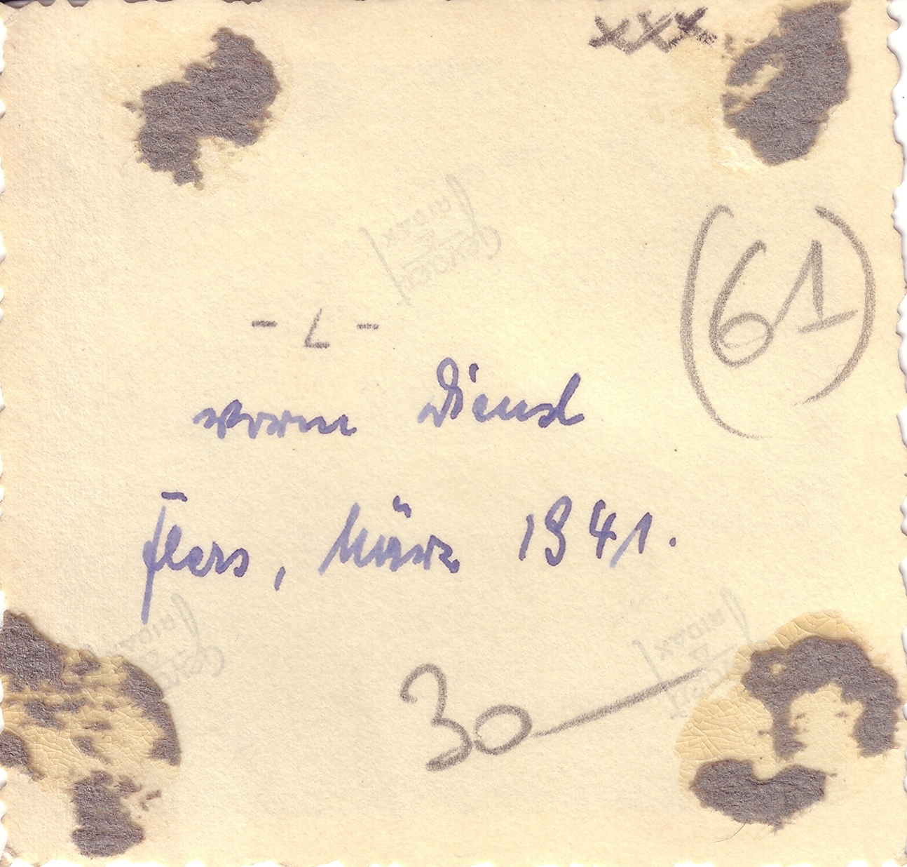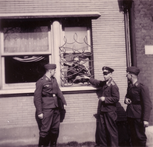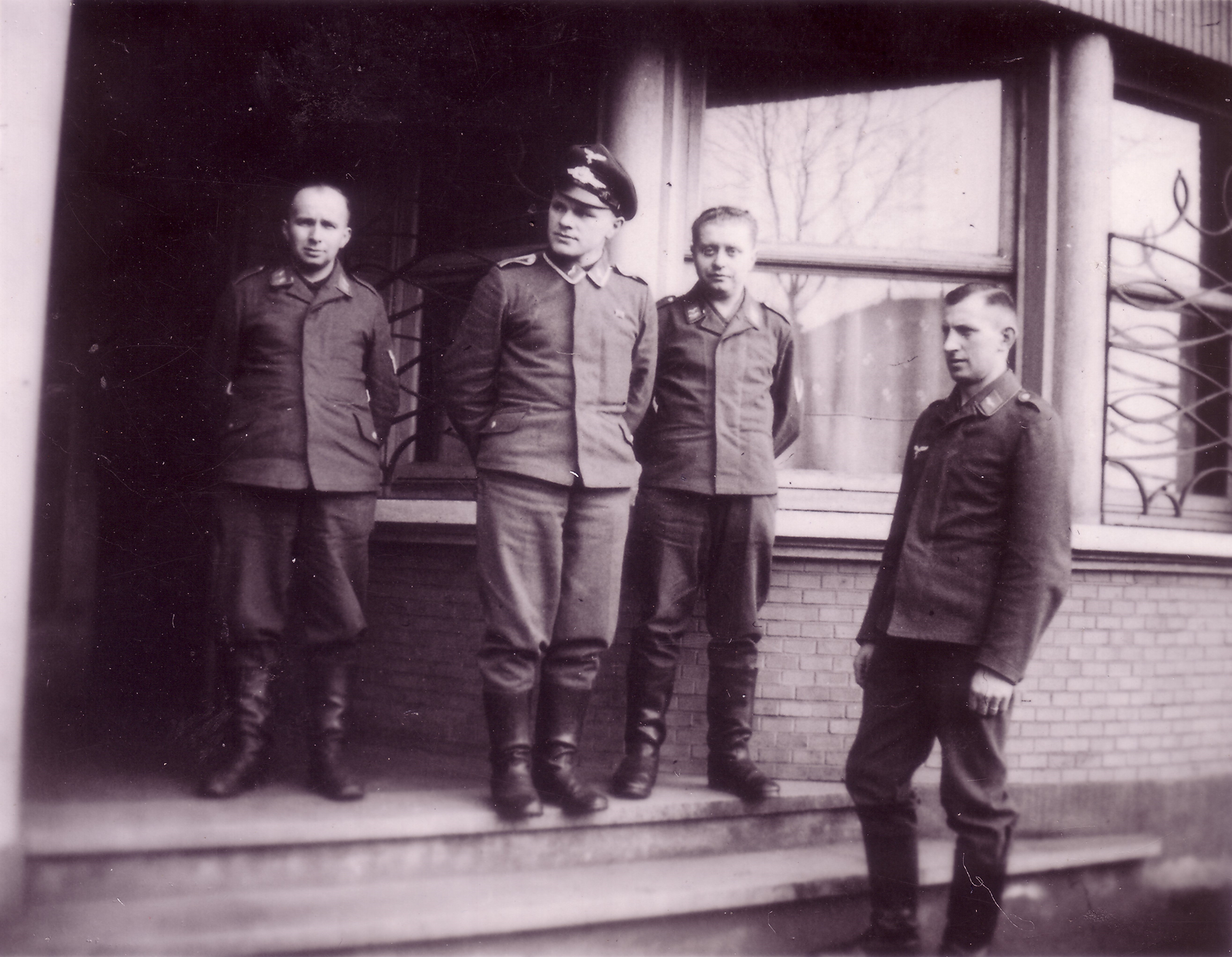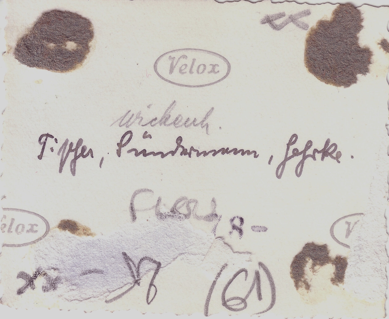 Photo n°3, recto et verso : L'homme du milieu, aux 4 mouettes en insigne, est un adjudant-chef (Oberfeldwebel). Il semble porter l'insigne des blessés. Derrière les barreaux, on distingue un caporal (Gefreiter). Les hommes de droite et de gauche sont de simples soldats (Flieger). Pour cette photo et la précédente, la couleur de fond des pattes de col, sur lesquelles sont les "mouettes", semble être rouge (Flak) ou jaune d'or (personnel au sol/navigant/parachutistes).