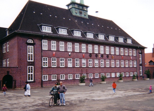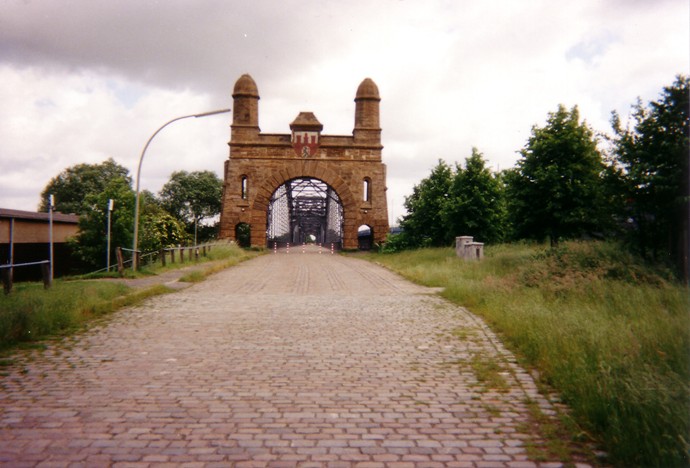 Cette piste cyclable franchit l’Elbe au cœur de Hamburg Mon passage à Hamburg me laissera le souvenir d’une ville tentaculaire, immense, et pourtant humaine. Beaucoup d’Allemands m’encouragent et me saluent en souriant. A la sortie de cette ville, alors que je me trouve face à un feu rouge, j’observe du coin de l’oeil une pauvre mémé qui attend de pouvoir passer. Elle est misérablement vêtue, et sa maigreur fait peine à voir. En y regardant de plus près, je me rends compte que c’est... un homme! Et qui me regarde! Et en souriant!! Et d’un air sensuel!!! Le feu passe au vert, je prends lâchement la fuite... Je traverse ensuite Neumünster, Rendsburg, Schleswig, une ville somptueuse dominant une baie d’une beauté à couper le souffle, Flensburg, et quitte l’Allemagne.