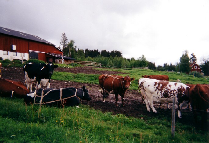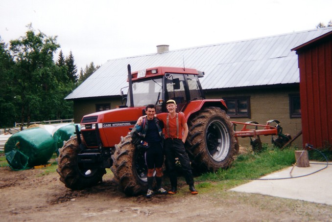 Dans une ferme suédoise Le soir du 16 juin, nous arrivons à Mora, une ville perdue en pleine forêt, située à 61° de latitude nord. Une Danoise me l’avait décrite comme étant très jolie. C’est exact, mais malheureusement un facteur la rend extrêmement désagréable: les moustiques! Ceux-ci pullulent en raison des pluies de printemps et de la douceur estivale qui règne au milieu de ces bois et de ces lacs. Ils représentent un réel problème. Dès que l’on s’arrête de rouler, il en vient un, puis cinq, puis dix, puis cinquante, et l’on se retrouve très vite entouré d’une nuée de ces insectes de malheur qui tour à tour viennent tenter leur chance sur notre peau. Il y a vraiment de quoi devenir fou avec ces affreux petits vampires! Essayez de vous représenter un peu à quel point peuvent être difficiles des choses aussi simples que manger, se reposer ou soulager sa vessie dans ces conditions. Vous souriez? Vous ne devriez peut-être pas... Imaginez en effet vos parties intimes recouvertes de boutons... Le seul remède: s’enduire de "repellent", c’est-à-dire d’un produit qui les repousse. Cela ne les empêche pas de rester à proximité ou de tournoyer autour de nos têtes, mais au moins ils ne viennent plus nous sucer le sang. Il vaut donc mieux rester stoïque et ne pas perdre son sang-froid, sinon c’est l’hystérie assurée... Erik et moi plantons donc nos tentes dans Mora à 22h, près de l’église. Ensuite, nous mangeons du riz et de la soupe tout en livrant une guerre acharnée aux moustiques. Nous sommes dans un petit parc pour enfants, au milieu de manèges et de balançoires. Pour manger à notre aise, c’est sur celles-ci que nous nous installons, car le mouvement nous protège efficacement des moustiques! Heureusement que personne ne nous voit, car on nous prendrait vite pour des demeurés! Mis à part un poivrot prénommé Donald qui nous demande si nous avons de la bière, personne ne nous dérange ce soir-là. Nous visitons le cimetière puis nous couchons à 1h du matin, alors qu’il fait encore jour... Le lendemain, nous continuons notre route au milieu de 1a forêt. De temps en temps, nous traversons quelques villes, comme Orsa, Edsbyn ou Alfta. Nous savons, grâce à un couple de cyclistes néerlandais, que le camping d’Alfta est gratuit pour nous. Nous y passons donc la nuit sans débourser un centime, notre avarice est enfin récompensée... La journée du 18 juin est une nouvelle fois gâchée par la pluie. Nous restons des heures à l’abri, avant qu’un jeune homme ne nous offre l’hospitalité pour la nuit. La côte du Golfe de Botnie est beaucoup plus peuplée que l’intérieur des terres. Une route très fréquentée, la E4, la longe sur des centaines de kilomètres. Nous traversons alors Bollnäs, Hudiksvall, Sundsvall, Härnösand, Örnsköldsvik et Umeå par un temps caniculaire. Même à ces latitudes élevées, on peut encore souffrir de la chaleur! Seulement, dès que le soleil se couche, 1e froid se fait cruellement ressentir. II faut alors s’arrêter pour passer la nuit au chaud, dans des petites villes de préférence, car les moustiques y sont moins nombreux qu’en forêt. En pleine "nuit", celles-ci présentent un aspect plutôt impressionnant de ville fantôme, car il fait jour et l’on ne voit pas âme qui vive! La route est bordée par la forêt. De nombreux panneaux préviennent les automobilistes du danger représenté par les élans. Ceux-ci traversent cependant rarement la route, car ils sont très sauvages. Nous n’en verrons d’ailleurs que deux à travers toute la Suède. Un matin, la pluie nous oblige à nous abriter quelques heures chez un fermier. Agé de 36 ans, celui-ci parle très bien anglais, et nous pouvons converser sans problème. Il exploite sa ferme avec son père et son frère, et nous fait visiter les lieux. En fait, tout cela ressemble fort à ce que l’on peut voir dans une ferme normande, chez mes parents par exemple. Je suis tout de même étonné de découvrir des ordinateurs ici.