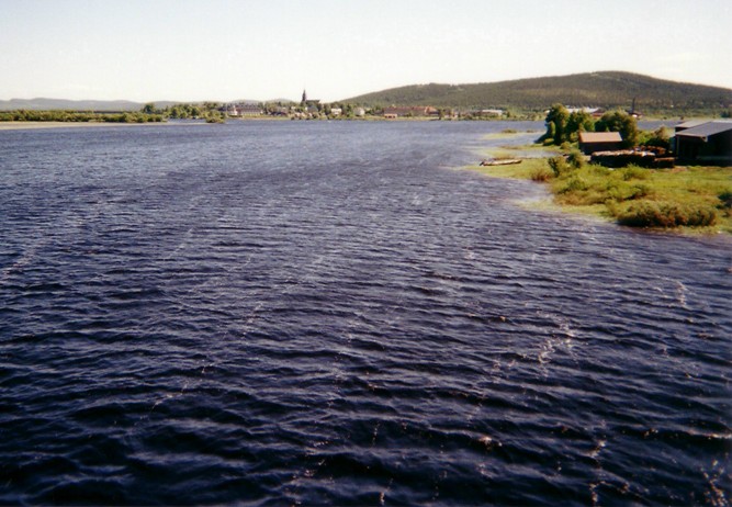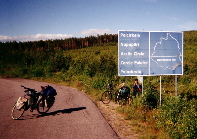 Överkalix, au nord du Golfe de Botnie Le lendemain, à 17h15, nous franchissons dans l’allégresse le Cercle Polaire Arctique. En cet endroit symbolique, situé à 66°33’ de latitude nord, on peut voir le soleil de minuit une fois dans l’année, et une fois seulement, le 21 juin.
