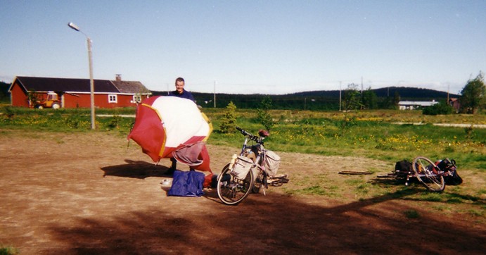 Erik et notre campement sur le terrain de football de Kätkäsuvanto, dans le nord-ouest de la Finlande.