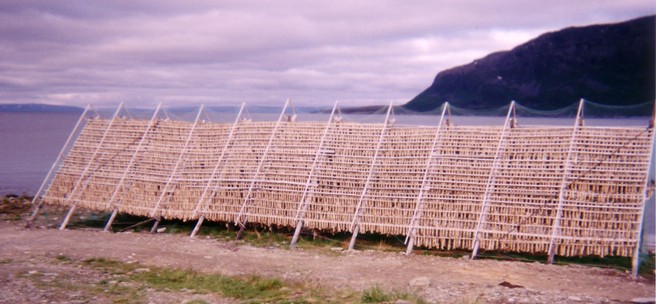 Poissons séchant au soleil. Le Cap Nord. Ce point symbolique est inhabité. Il est situé à 71°10’21’’ de latitude nord, à l’extrémité de Magerøya, une île de 436 km² sur laquelle vivent plus de 4000 personnes. Les principales industries locales sont basées sur la pêche et... le tourisme! En effet, ce lieu attire chaque année des milliers de touristes, désireux de découvrir le point le plus septentrional d’Europe. Une comparaison: à vol d’oiseau, le Pôle Nord se trouve à 2100 kilomètres et Paris à 2800! L’effet polaire est donc ressenti ici, mais sans le Gulf Stream, les températures seraient en moyenne inférieures de trente à quarante degrés l’hiver! Le soleil de minuit est visible au Cap Nord du 14 mai au 30 juillet, soit 77 nuits consécutives pendant lesquelles le soleil ne se couche pas. En contrepartie, la saison sombre dure deux mois. Le promontoire rocheux du Cap Nord est à 307 mètres au-dessus du niveau de la mer. La route monte donc, et nous nous épuisons à franchir les cols de l’île. Le paysage offert par Magerøya est lunaire, dantesque, désolé, complètement nu. Tout n’est que rocaille, seules quelques timides fleurs, mousses et lichens émergent parfois entre les rochers.