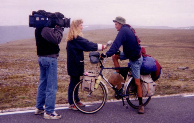 Sur l’île de Magerøya De fréquentes plaques de neige compacte apparaissent ici et là. Le cœur de l’île n’est habité que par quelques Lapons plus ou moins nomades, vivant de l’élevage du renne et du tourisme. Nous ne sommes plus qu’à un kilomètre du Cap Nord. C’est alors qu’une voiture nous double au sommet d’une côte. J’ai un peu d’avance sur Erik qui peine dans la montée et vois surgir un couple de cette voiture qui vient de s’arrêter. La femme porte un micro et l’homme une caméra sur l’épaule. Ils me saluent au passage et courent vers Erik. Je n’en crois pas mes yeux. J’attends quelques instants puis rebrousse chemin. Effectivement, ils sont bien en train de l’interviewer! En un éclair, je saisis mon appareil photo afin d’immortaliser la scène. La jeune femme est en train de dire à Erik, en anglais: "Vous regardez la caméra et vous dîtes: Erik s’exécute avec difficulté pendant que j’observe tout ce petit monde, incrédule. Les deux reporters se tournent alors vers moi, et la jeune femme me demande: "Voulez-vous être interviewé? Et me voilà à mon tour interviewé!