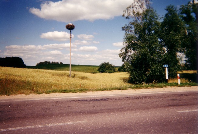 LA LITUANIE La Lituanie est très rurale, et semble encore plus pauvre que la Lettonie et l’Estonie. Beaucoup de charrettes tirées par des chevaux circulent encore. Je vois aussi de nombreux cyclistes, mais vu le triste état de leurs bicyclettes, je comprends qu’ils ne l’utilisent que par manque de moyens. S’il ne fallait retenir de ce pays que des images touristiques, ce seraient sans conteste les cigognes et les calvaires, fort nombreux.